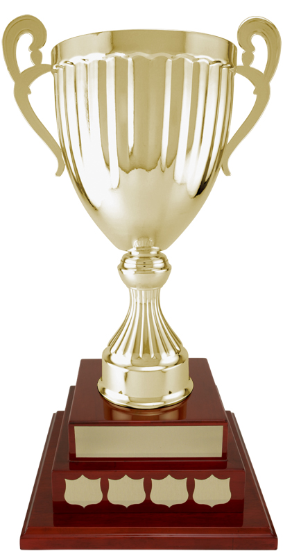 embodying the full tradition of the winner's cup. The tiered base is a solid hardwood.
