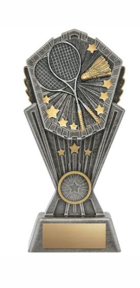 The Cosmo badminton trophy is constructed using a resin material and is detailed in a painted finish.
